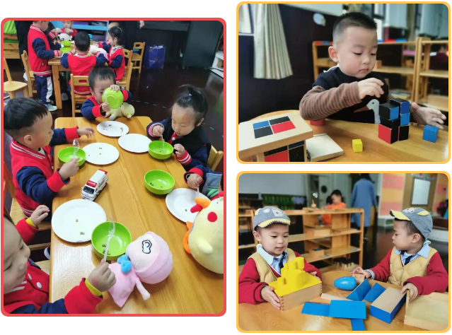 ①蒙台梭利教育与传统教育有机结合,开设:日常生活、感官、数学、科学文化、语言五大领域课程及其延伸主题教育活动,注重在自由、平等、规则、有爱的环境中培养幼儿的专注力、秩序感、动手能力和逻辑思考能力.